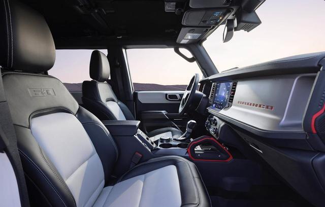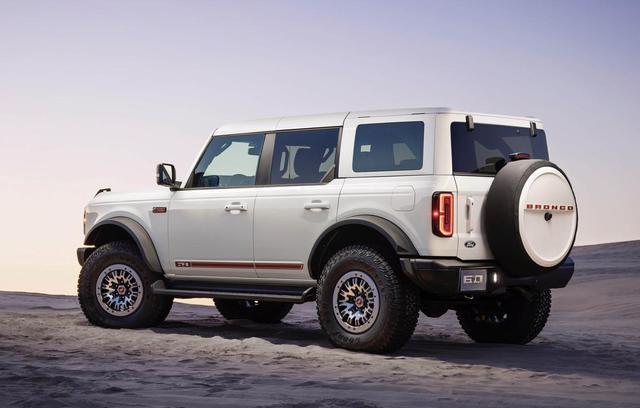从最直观的颜值方面来看,福特烈马60周年纪念版致敬经典,采用了“时光胶囊”的设计理念,整个车头造型方正,前舱盖与整个车头一气呵成,正前方加入了下沉式的线条,一体式格栅与两侧正圆形的前大灯融为一体,中间还配备了红色的“BRONCO”车标,辨识度很高。粗犷的前包围配备了左右对称式的圆形雾灯,两个拖车钩设计以及粗犷的金属防撞梁和金属防刮擦护板,还预留了安装绞盘的空间,展现出了十足的硬派气息。车尾配备了全尺寸外挂式备胎,备胎后壳依旧配备了醒目的红色“BRONCO”尾标,尾部竖状形尾灯组设计较为复杂,侧向开启尾门以及双边四出的运动排气也没有缺席。粗犷的后包围设计也更加独特。