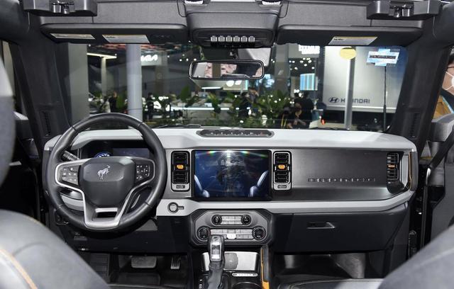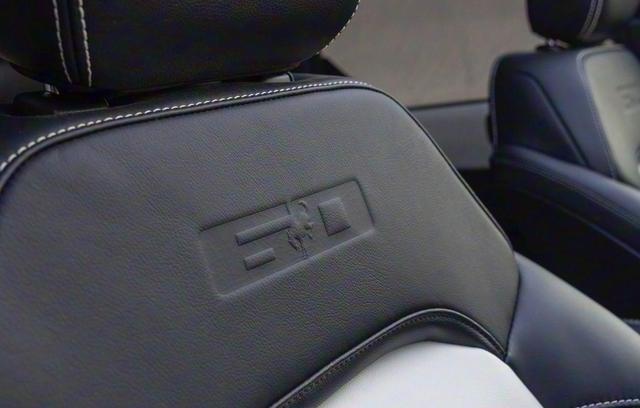 进入车内,福特烈马60周年纪念版延续了现款在售车型的经典的设计布局,大面积黑灰色翻毛皮材质的铺陈,搭配着红色的手工双缝线、红色的空调出风口装饰条、红色的安全带设计、红色的把手内侧装饰,就连方向盘的回正皮标和一键启动按钮都采用了红色的装饰。再加上大面积碳纤维装饰面板的点缀,银色钻石切割的旋钮,副驾驶手套箱装饰面包也加入了鹦鹉黄色的手工刺绣,提升了整车的档次感。座舱擦一了Alpine真皮包裹,黑檀木色外框搭配白色缝线,靠背上绣着“60”字样,双色皮革内饰扑面而来,瞬间把意境拉回黄金年代。中控台配备了四辐式多功能方向盘、全液晶仪表、内嵌式中控液晶大屏,上方是蠕行模式、三把差速锁、双闪触摸感应式按键,下方保留了很多圆形的旋钮、两驱/四驱旋钮以及别致的换挡手柄。