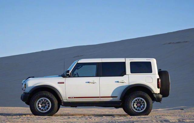 来到车色侧面,福特烈马60周年纪念版车型采用了经典的方盒子轮廓,大量横平竖直的线条勾勒,还配备了笔直的高腰线设计,四个机械式的门把手下方是朱红色贴花,前挡泥板处浮雕工艺徽章上写着“60周年”,格栅上复古字母标识与同色轮毂盖形成呼应,轮毂盖上还刻着“BuckingBronco”野马图案、“1966”字样,细节满满,每一个地方都在传递历史温度。配备的35英寸越野胎和复古套件,也带来了更强的视觉冲击力。车顶还配备了Yakima机架,十分硬派。车身尺寸方面,该车的长宽高分别为4878mm、1925mm、1734mm、轴距2850mm,属于中大型SUV车型。