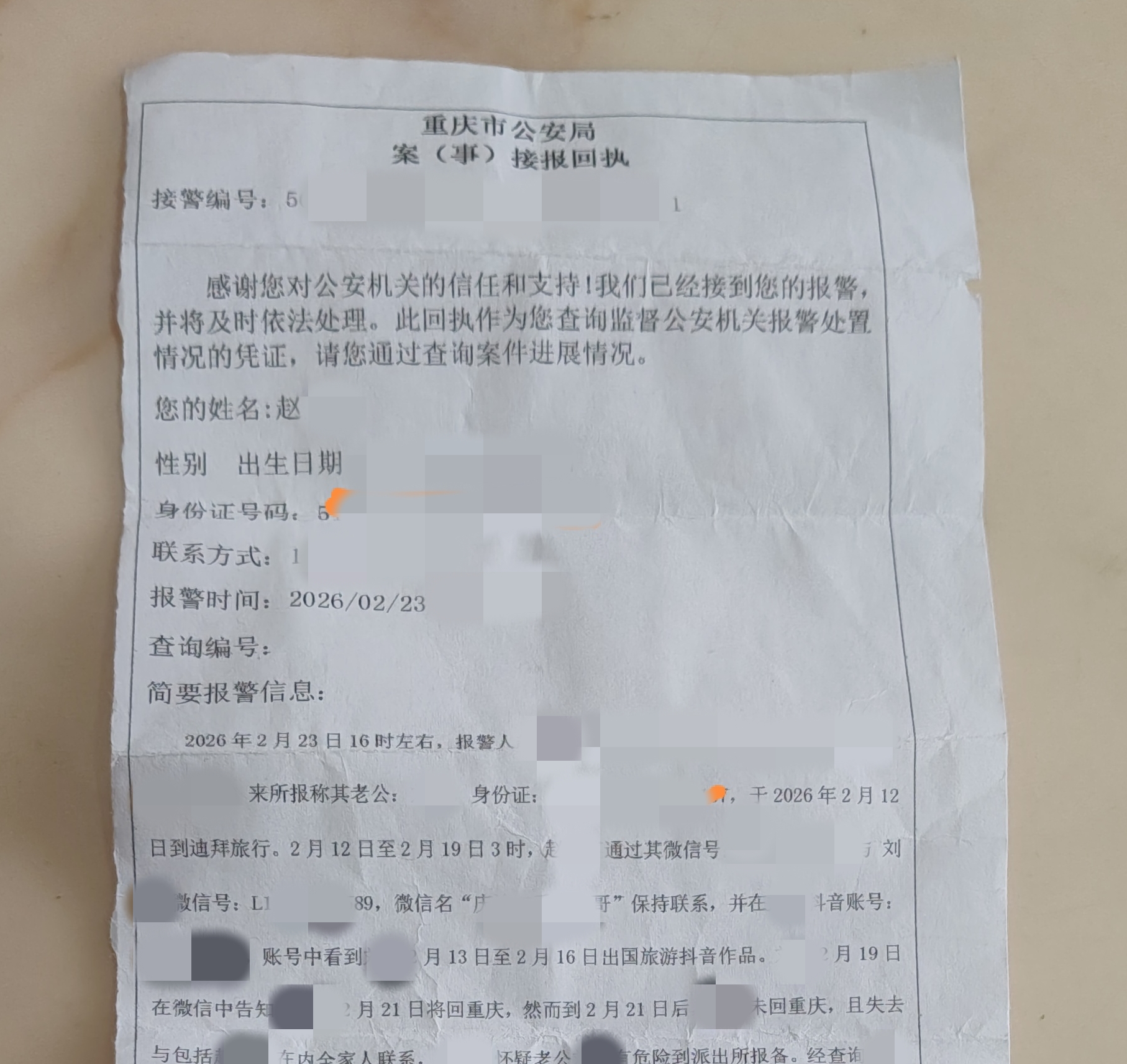 警方出具的回执单。